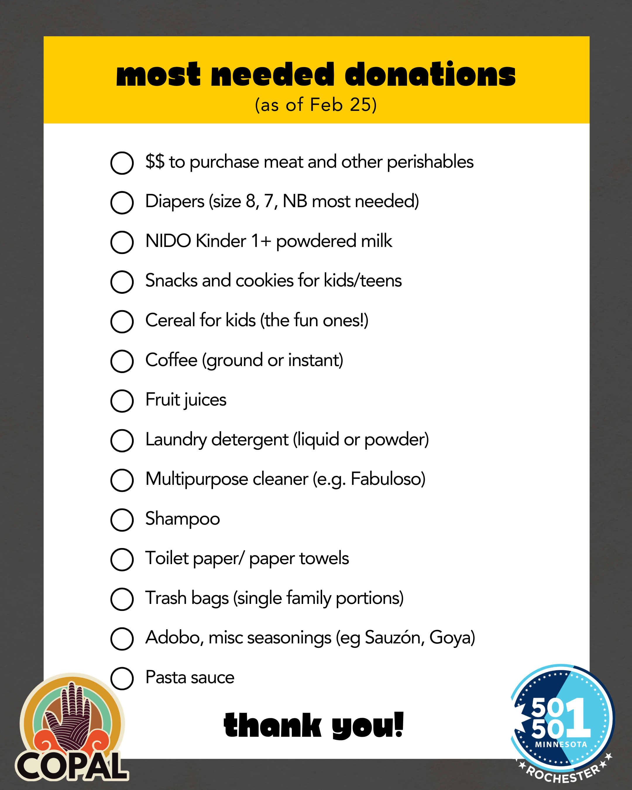 1) Direct daily assistance for food, rides, and other family needs - send to MN50501-Rochester. Money sent to our Venmo or Zelle can be used immediately for shopping or other needs. All of our money and most volunteer energies at this time are being used in our mutual aid network supporting COPAL. MN50501 is a 501(c)4 nonprofit, so donations are not tax-deductible.